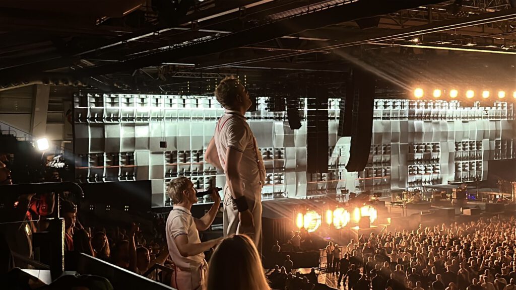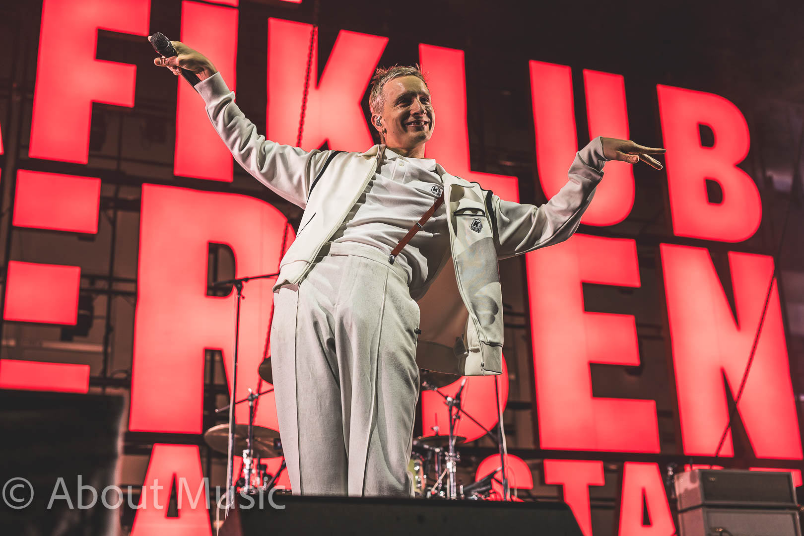Seit Jahren zählen Kraftklub zu den absoluten Live-Acts, und gestern ließen sie ihrem Ruf erneut Taten folgen. Im typischen Stil der Band begann der Abend um 20:20 Uhr mit dem markanten roten Schriftzug „KRAFTKLUB – STERBEN IN KARL MARX STADT“, der die Schleyerhalle in ein rotes Meer tauchte. Kurz darauf traten die Hauptakteure auf die Bühne, wie gewohnt einheitlich gekleidet: weiße Hosen, weiße Shirts und die ikonischen roten Hosenträger, die inzwischen zum Markenzeichen geworden sind und von vielen Fans als Accessoires gefeiert wurden.
