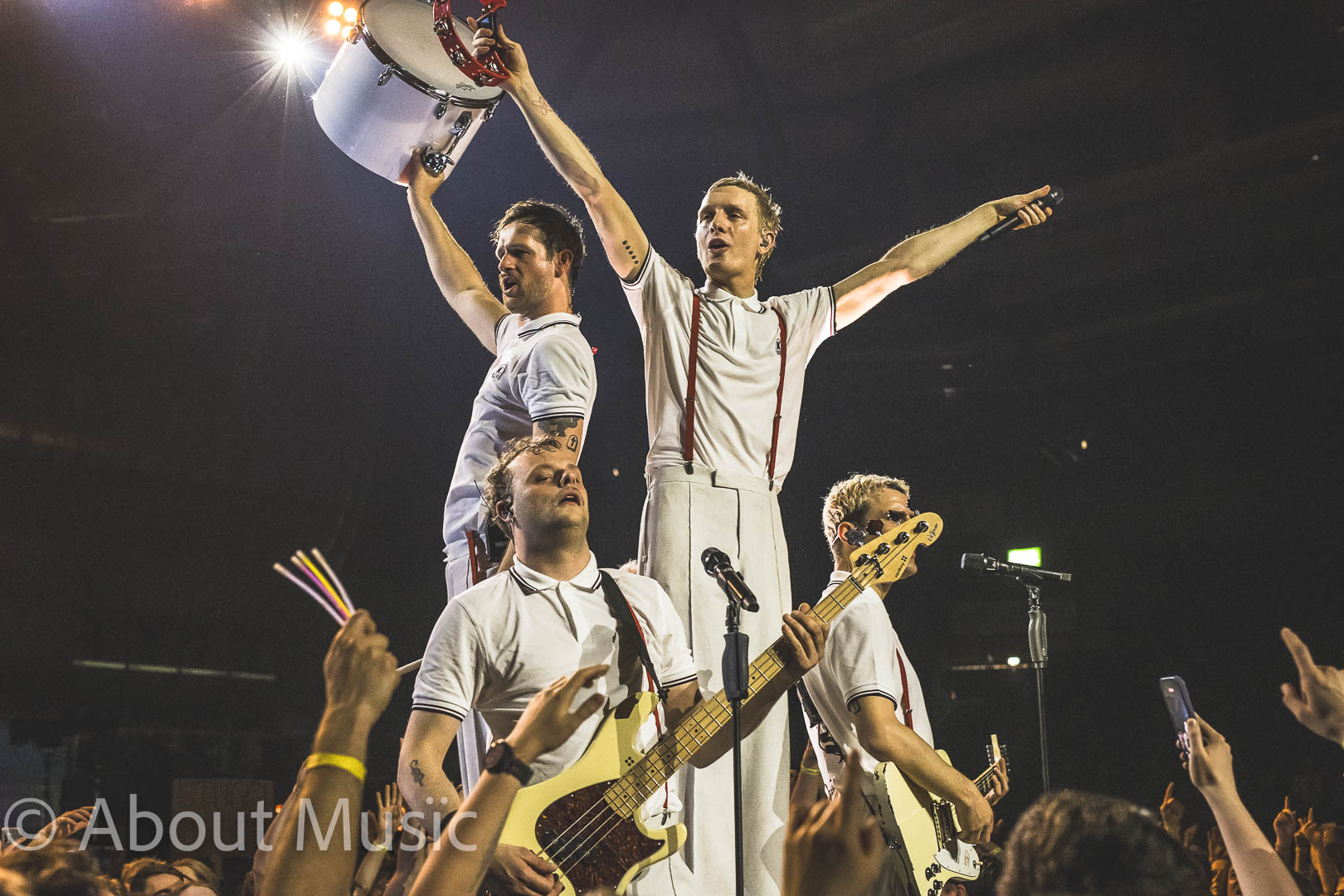 Kraftklub starteten ihr Set direkt mit Marlboro Mann, Ein letztes Mal und All die schönen Worte – drei Songs aus dem aktuellen Album, die die Schleyerhalle sofort in einen Hexenkessel verwandelten und die ersten von unzähligen Moshpits lostaten. Hinter der schlichten Bühne hänt eine riesige LED-Wände, die teils Live-Bilder der Band zeigten.